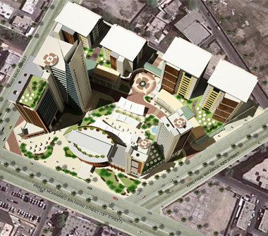 • فندق 5 نجوم: يحتوي على 412 غرفة وجناح لمبنيين أحدهما مخصص للغرف الفندقية والآخر للأجنحة الفندقية، يتضمن بهو مشترك، غرف اجتماعات، قاعة حفلات، منتجع صحي وصالة ألعاب رياضية، مطعم، وبرك سباحة، يرتفع البرج الأول إلى مستوى 12 طابق، والبرج الثاني بارتفاع 16 طابق.